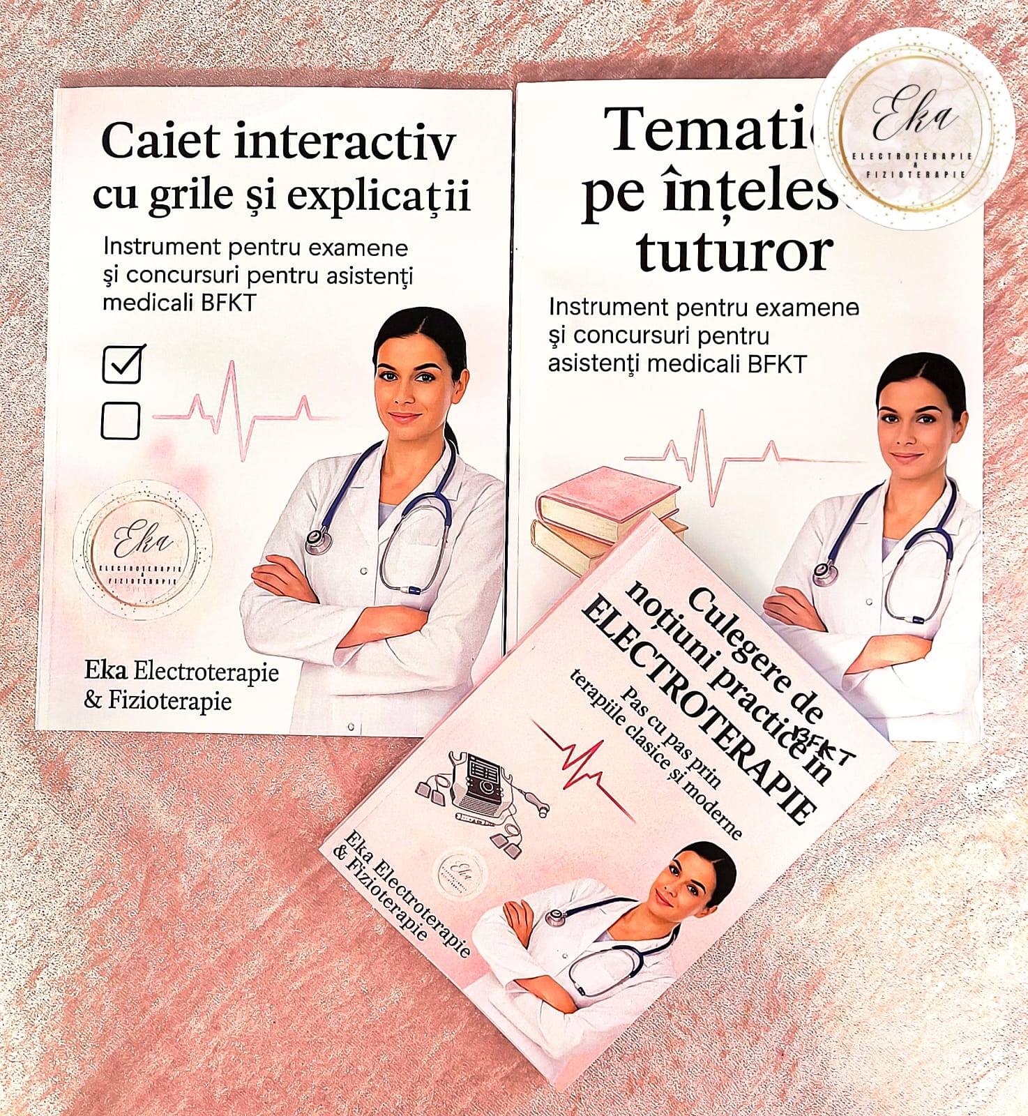 Tematica pe înțelesul tuturor – BFKT 2025 Ghid explicativ complet pentru pregătirea examenului de grad principal în Balneofiziokinetoterapie și Recuperare Medicală Descriere: Cartea „Tematica pe înțelesul tuturor” este mai mult decât un simplu material de studiu — este ghidul care transformă tematica stufoasă de examen într-o lectură logică, clară și accesibilă, pe care o înțelegi și o reții cu ușurință. Creată special pentru asistenții medicali BFKT, această carte te ajută să parcurgi întreaga programă oficială într-un mod prietenos, explicat pas cu pas, cu exemple practice și analogii care fac legătura dintre teorie și realitatea din cabinetul de fizioterapie. Scrisă într-un limbaj cald și clar, cartea te ghidează prin conceptele de bază din electroterapie, termoterapie, kinetoterapie, masaj, fototerapie și alte terapii specifice, astfel încât să înțelegi nu doar ce trebuie să înveți, ci și de ce. Ce conține: Explicații logice și ușor de urmărit pentru fiecare capitol din tematica oficială Exemple practice din activitatea de zi cu zi în fizioterapie Definiții, clasificări și concepte explicate simplu Sfaturi și observații utile pentru examen Design medical elegant, în stilul Eka Electroterapie & Fizioterapie Pagină introductivă cu semnătura autoarei Beneficii pentru tine: Înveți fără stres, într-un ritm natural și logic Înțelegi conceptele de bază, nu doar le memorezi Te pregătești mai sigur pentru examenul de grad principal Ai o carte scrisă pe înțelesul tău, de către un profesionist din domeniu Include în pachet: un pix personalizat, un semn de carte, un carnețel pentru notițe în timpul învățării, cadou un autocolant, un breloc medical și un săculeț parfumat