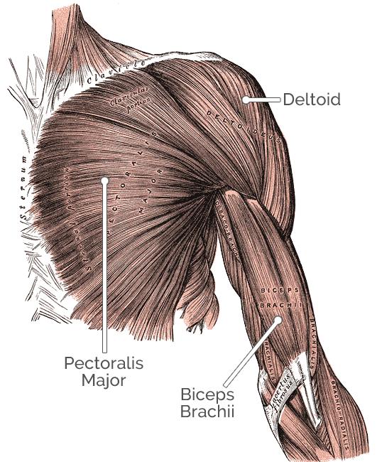 - Coracobrahial: Participă la flexia și aducerea brațului în față.