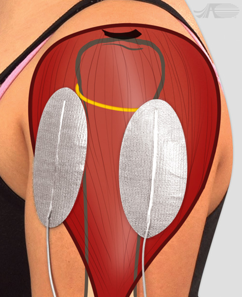 Plasarea electrozilor pentru flexia și abducția umărului poate fi observată aici, cu un electrod plasat peste deltoidul anterior și celălalt peste deltoidul mijlociu. Acromionul este marcat cu markerul. În prima noastră plasare, electrodul negativ al semnalului asimetric este plasat peste deltoidul anterior și se poate observa că stimularea rezultantă este una predominant de flexie.