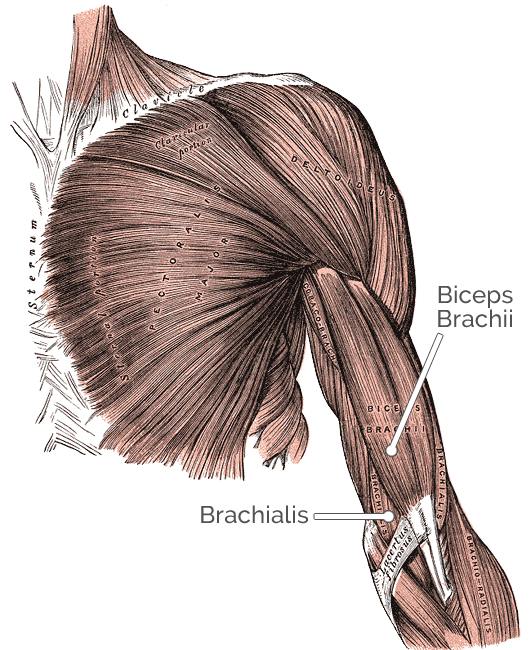 - Inervație nervoasă: Nervul musculocutanat (C5-C7) și nervul radial