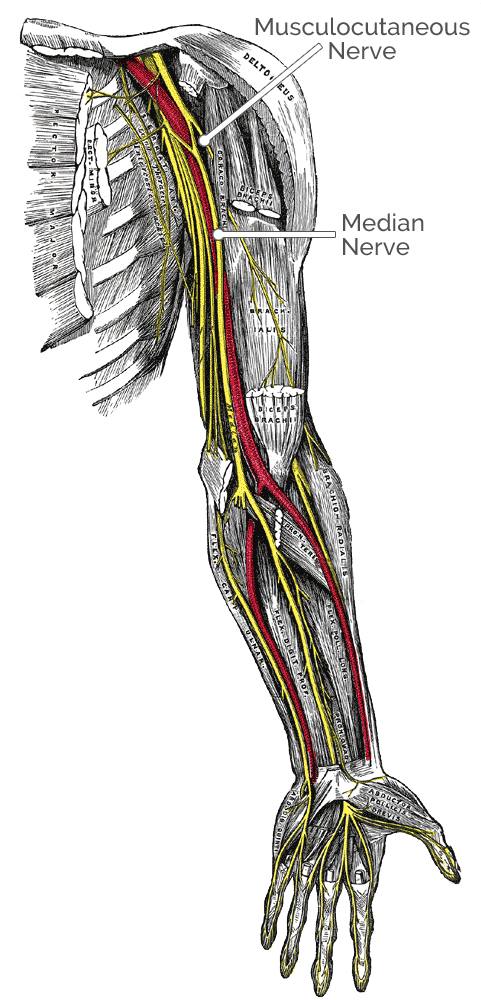 - Rădăcina nervoasă: Nervul musculocutanat (C5-C7), nervul radial C5, C6