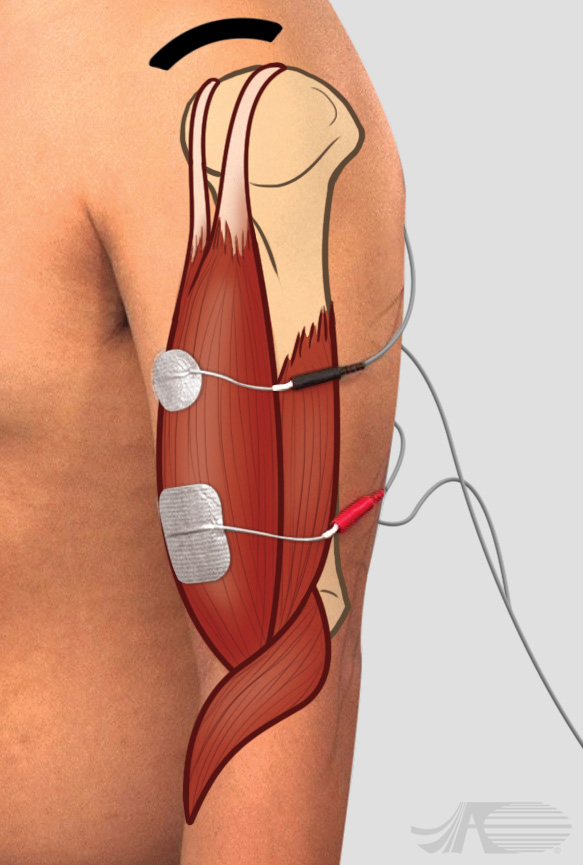Plasarea electrozilor pentru stimularea bicepsului, care va duce la flexia cotului. Poți observa semnul acromionului la umăr. În această imagine detaliată a electrozilor, se vede un electrod relativ mic pe mușchiul bicepsului, acesta fiind electrodul negativ. Electrodul pozitiv este plasat mai aproape de șanțul cotului.