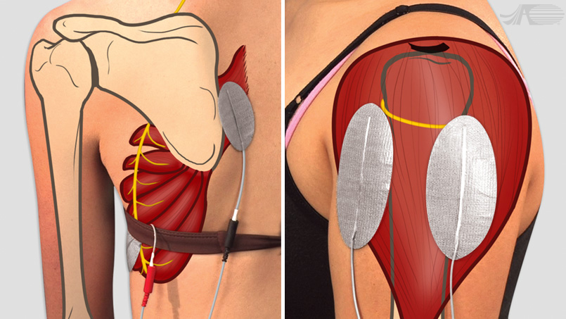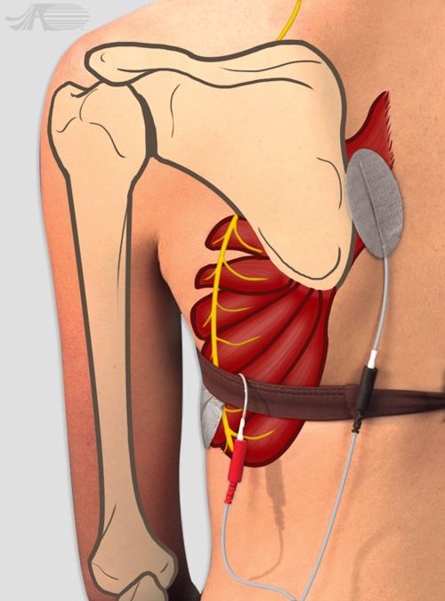 Plasarea electrozilor pentru retracția scapulei. Electrodul negativ este plasat sub scapulă cât de mult posibil. Electrodul pozitiv este plasat pe porțiunea inferioară a mușchiului serratus anterior.